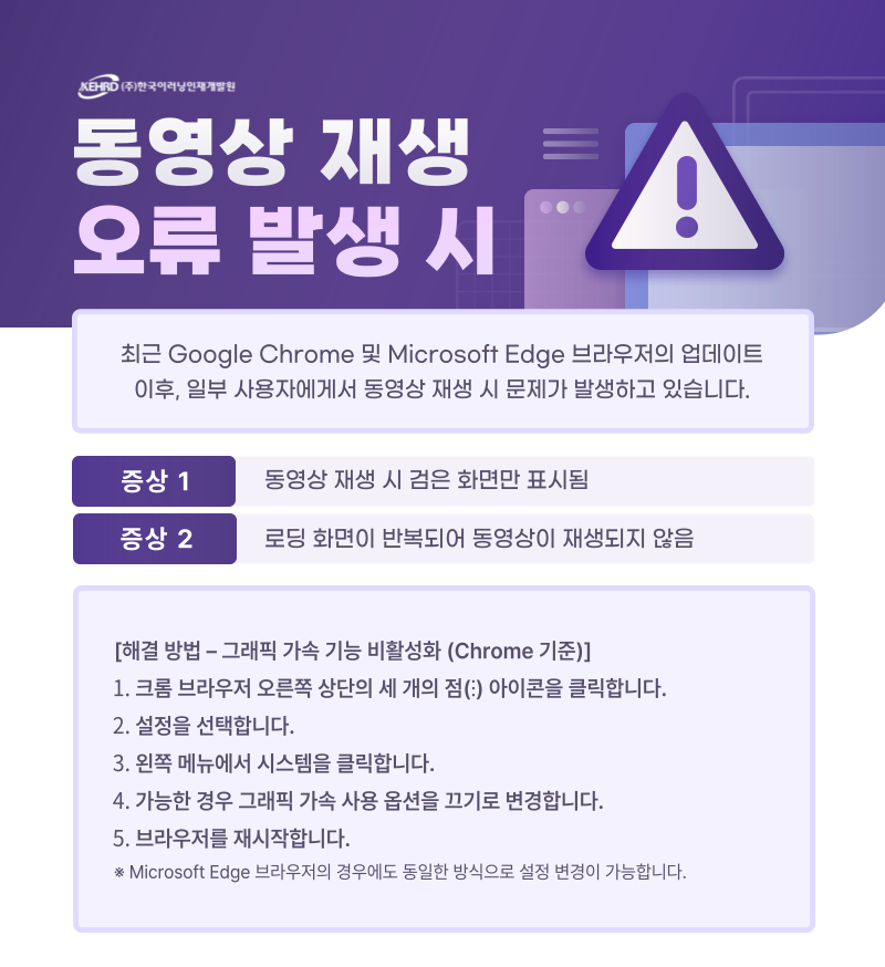 최근 Google Chrome 및 Microsoft Edge 브라우저의 업데이트 이후, 일부 사용자에게서 동영상 재생 시 문제가 발생하고 있습니다.